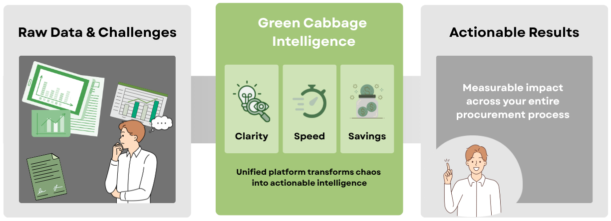 Los equipos de compras suelen tener que lidiar con recursos limitados, prioridades cambiantes y datos incompletos. Green Cabbage ayuda a subsanar esas deficiencias con una solución unificada y basada en la inteligencia que aporta claridad, rapidez y ahorros reales.